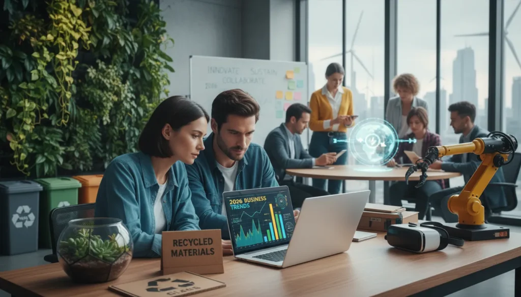 Equipe de pequena empresa colaborando em ambiente sustentável e inclusivo, evidenciando responsabilidade social